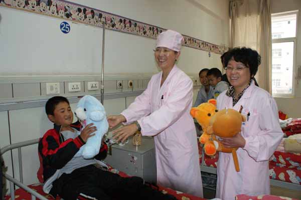 上午9点,院领导走进儿科病房,将价值3200元的玩偶、公仔等礼物送给患儿,带去鱼虾蟹游戏的关爱和祝福,与患儿家长亲切交谈,安抚和鼓励小朋友们战胜病魔,早日康复,受到家长和小朋友们的热烈欢迎。