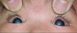 2、视网膜母细胞瘤:是视网膜的胚胎性恶性肿瘤,占儿童眼部肿瘤的首位。此症多在三岁以前发病,75%为单眼患病。初期有约20%因患儿出现患眼斜视,因患者年龄小不能自述患眼视力下降而使病情被忽视,当瘤体长入玻璃体后瞳孔散大呈黄白色反光,才引起家长注意,故有黑朦性“猫眼”之称。如得不到及时治疗,患者的死亡率近100%,故一旦确诊应及时行眼球摘除术,以挽救患者的生命。