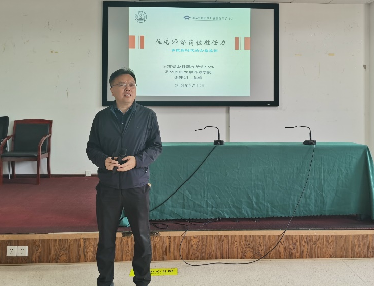 开班第一课由昆明医科大学海源学院副院长,云南省全科医学培训中心办公室主任李伟明教授为大家授课,李教授从5+3+X+继续医学教育模式讲起,阐述住培师资队伍要以“四新”引领医学教育发展,以“五术”践行医学教育实践,培养优秀的医学接班人。李教授的授课幽默风趣,课堂气氛活跃,在润物细无声中诠释了住院医师规范化培训师资的岗位胜任力,教师们在愉快的氛围中收获满满。