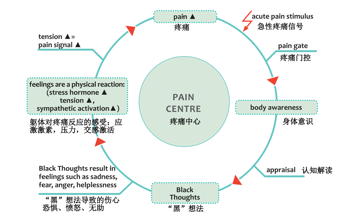 我们在谈论孩子时,常常会说“我的孩子”怎么样,但我们常常忽略了这个孩子绝大部分时间是“幼儿园、小学或中学(社会环境)的孩子”,一般儿童三岁就开始接触社会(上幼儿园),孩子完全属于家庭的时间其实只有三年,如果孩子因为慢性疼痛而完全离开学校,那么她/他将一直待在三岁以前,永远只是“三岁娃娃”。成绩的下降导致学业的压力,同学的疏远和老师的责备,进一步从简单的头痛或腹痛的躯体症状演变为抑郁或焦虑(Depression and anxiety),甚至灾难性想法(Catastrophising thoughts)的心理并发症。而这些情况会加重头痛或腹痛等慢性疼痛的症状,加剧疼痛的恐惧并形成逃避模式(Fear-Avoidance Model),最终,孩子失去适应疼痛的能力(Pain coping strategies),也失去了适应社会(学校)的能力。