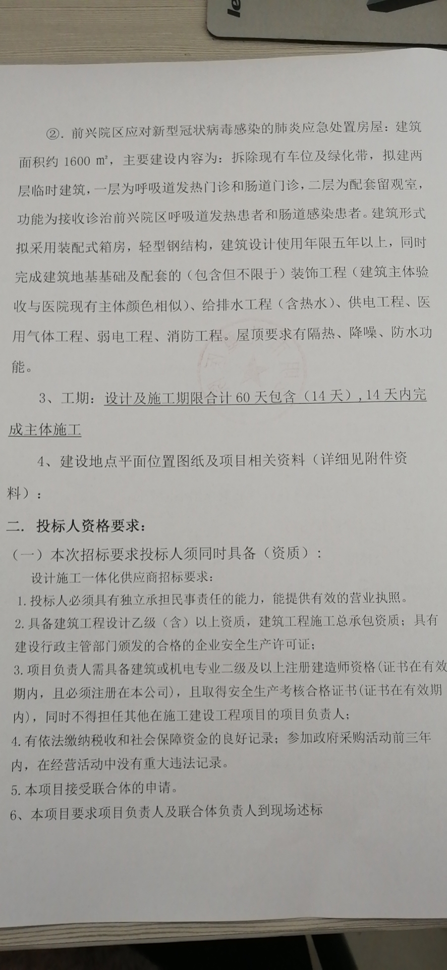 ②.前兴院区应对新型冠状病毒感染的肺炎应急处置房屋:建筑面积约1600㎡,主要建设内容为:拆除现有车位及绿化带,拟建两层临时建筑,一层为呼吸道发热门诊和肠道门诊,二层为配套留观室,功能为接收诊治前兴院区呼吸道发热患者和肠道感染患者。建筑形式拟采用装配式箱房,轻型钢结构,建筑设计使用年限五年以上,同时完成建筑地基基础及配套的(包含但不限于)装饰工程(建筑主体验收与鱼虾蟹游戏现有主体颜色相似)、给排水工程(含热水)、供电工程、医用气体工程、弱电工程、消防工程。屋顶要求有隔热、降噪、防水功能。